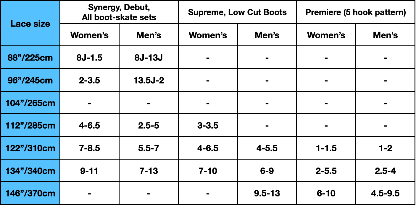 For other brands, please refer to the size charts linked below and choose the closest WarmEdge lace length that is longer than the recommended size.